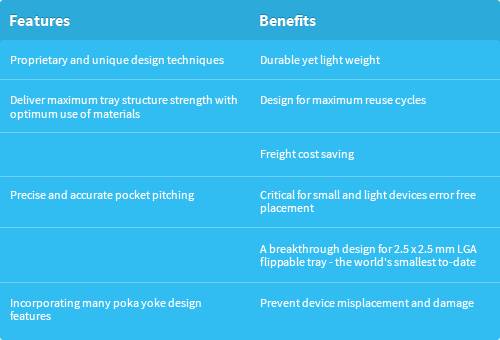 We offer Jedec trays that reflect our relentless pursuit in design philosophy to combine the best of both worlds - maximum durability and light weight.