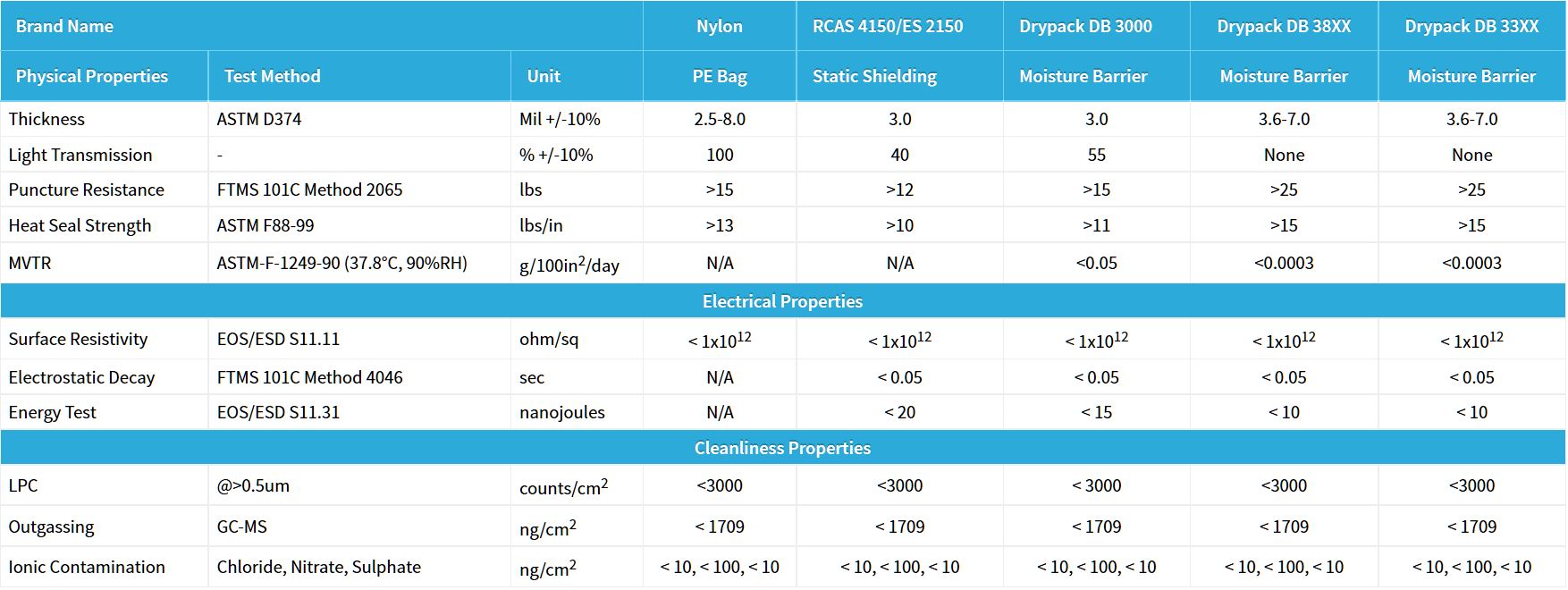 Drypack DB 33XX series employs a static dissipative outer layer of polyolefin and a cost effective alternative to DB 38XX series. A solid aluminum foil middle layer and an inner layer of antistatic polyethylene are used to provide moisture vapor protection and guard contents against triboelectric charging.