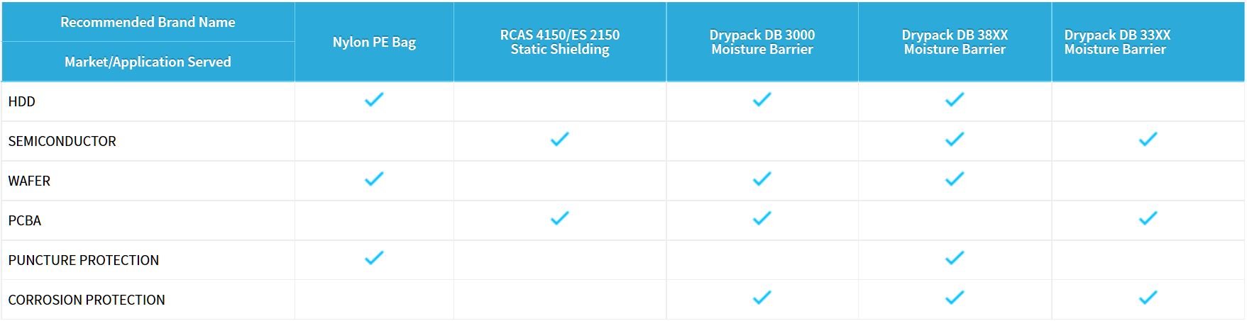 Drypack DB 3000 series uses film that is designed for packaging of Hard Disk Drive applications. These packaging materials have the same antistatic inside sealant layer, a very thin layer of vacuum deposited aluminum on a substrate or solid and with the moisture barrier layer to provide moisture protection.