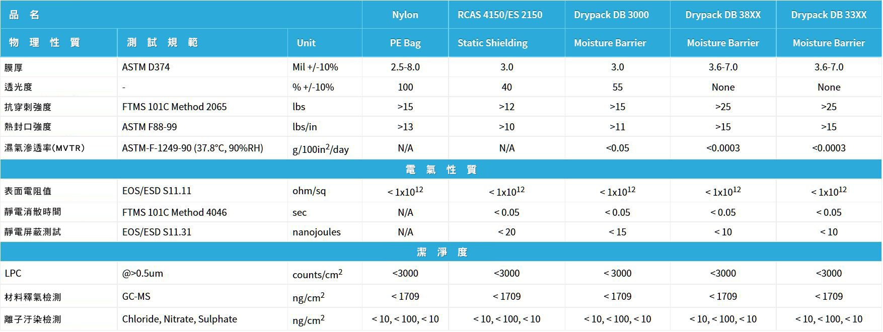 Drypack DB 38XX 系列是專為半導體領域所開發的高阻隔鋁箔層壓防潮袋,它是用於真空包裝捲帶/捲盤、IC Tray盤、包裝管的最佳選擇。